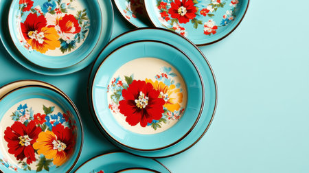 Colorful ceramic plates featuring floral designs are arranged aesthetically on a light blue surface, showcasing their intricate details and vibrant hues. The setup is eye-catching and artistic.