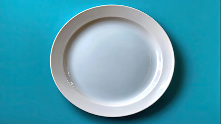 This image features a sleek, empty white plate set against a bright blue background. Ideal for showcasing food presentations, culinary art, or restaurant themes.