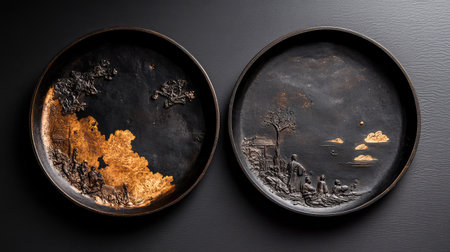 This striking image showcases two artistic decorative plates featuring intricate relief designs. The plates depict scenic landscapes and natural elements, offering a unique blend of texture and elegance, perfect for home decor enthusiasts.