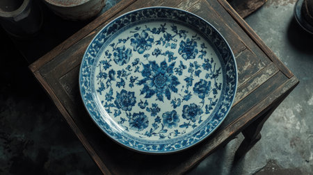 A sophisticated blue patterned plate rests on a weathered wooden table, showcasing a blend of rustic charm and elegant design. Ideal for food presentation and culinary imagery.