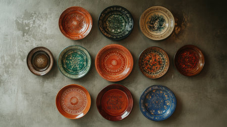 An artistic display of colorful ceramic plates and bowls showcasing intricate designs and textures, perfect for enhancing any dining space or collection.