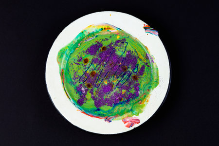 On a dark background, a plate with green paint and shiny purple spots .Abstract work of art. Preparation of material for modern painting techniques.