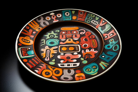 marvelous colorful aztec plate, black background, illustration, generative ai