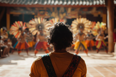 Tourist admiring traditional Balinese dance performance in Indonesia, experiencing local culture and heritage