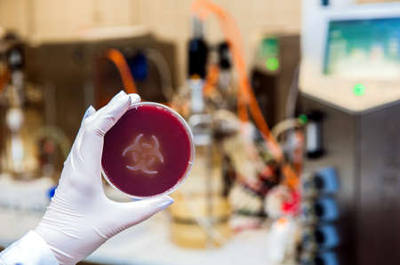 A hand in disposable glove holding up a petri dish with a bacteria culture in the shape of the biohazard symbol in a biotechnology laboratory.