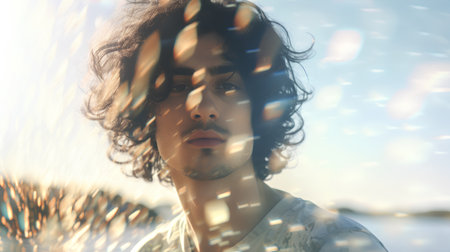A young man with expressive curly hair reflects in sunlight, casting intriguing shadows. This portrait captures a serene moment that resonates with beauty and thoughtfulness.