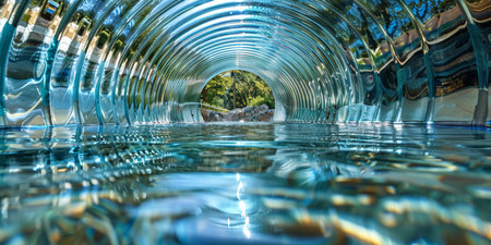 A captivating underwater perspective of a water slide tunnel, featuring shimmering water reflections.