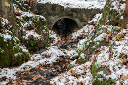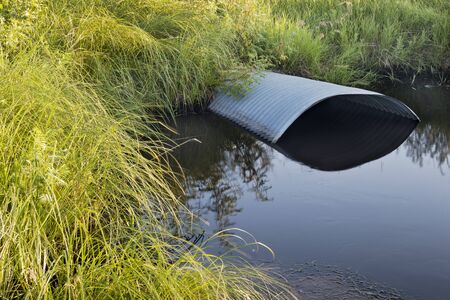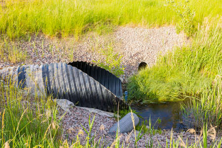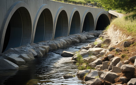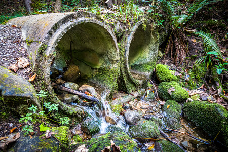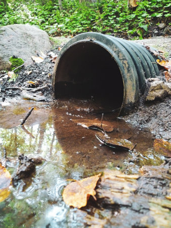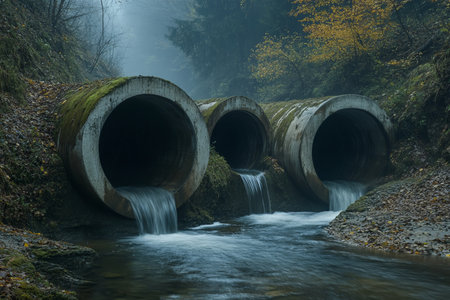 Drainage pipe discharges water into serene creek surrounded by lush greenery and rocky terrain. tranquil scene captures beauty of nature, contrasting with artificial pipe