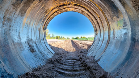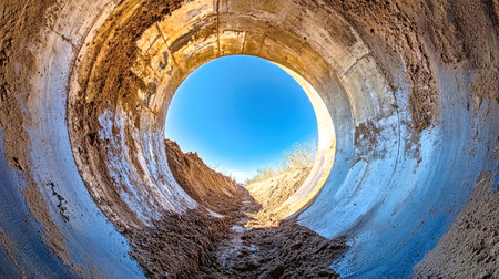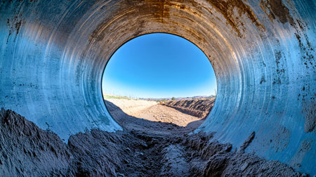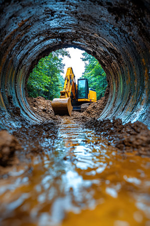 An excavator digging soil framed within a large pipe, dynamic wideangle perspective under clear blue skies
