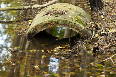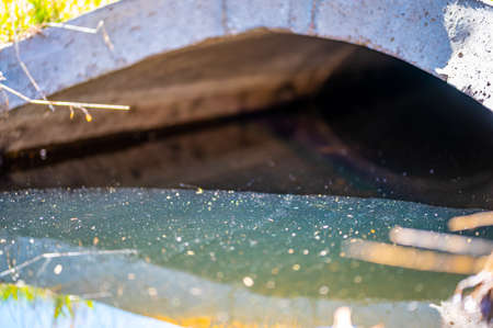 Concrete pipes draining in the swamp, a small water channel in a swamp