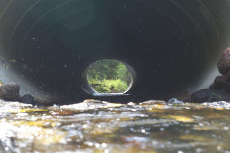 The tunnel cement pipe has black shadow and light at the end of the tunnel.