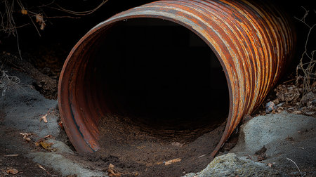 Exploring a winding pipe water flowing through a rusty tunnel in photography style