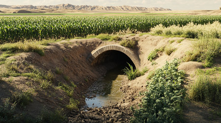 A small stream of water flows slowly towards a round concrete drainage pipe, framed by natural greenery, combining urban infrastructure with the tranquility of nature.