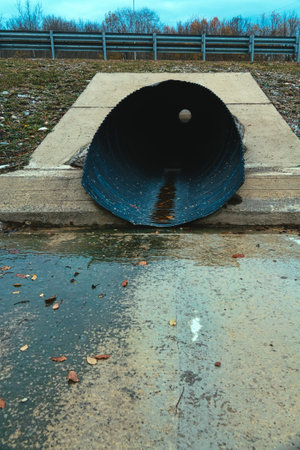 Close up view of drainage pipes coming out on side of road. building technology concept.