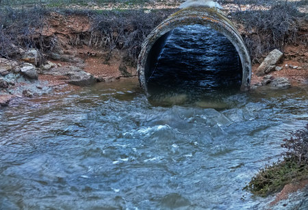Close-up of waste flowing from industrial pipes into a natural stream, highlighting environmental pollution