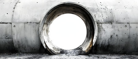 Blurry foreground of a large round concrete pipe hole against a white background ideal for adding text or design. Concept Concrete Pipe, White Background, Blurry Foreground, Text Space