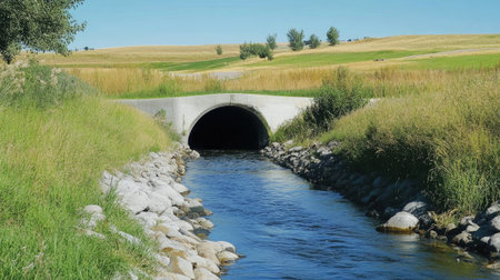 This image features a tranquil water stream flowing through a picturesque rural landscape, showcasing a concrete culvert, green grass, and trees under a bright blue sky.
