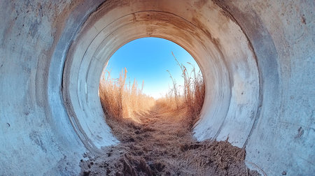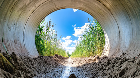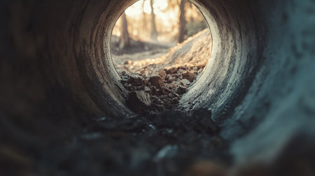 A captivating view through a pipe, showcasing a serene natural landscape illuminated by warm sunlight. The textured surface and ground debris invite exploration.