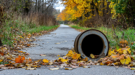 A weathered pipe rests on a serene pathway adorned with falling autumn leaves, embodying a tranquil landscape and the beauty of seasonal change.