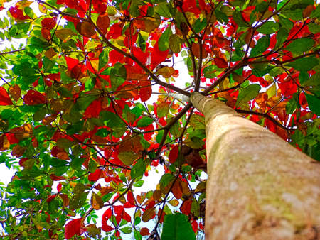 bottom view of a large tree near trunk with coming sunlight through leaves or tyndall effect in terms of science