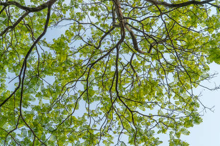 Close up of green leaves on tree with blue sky background in sunny day