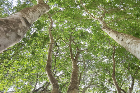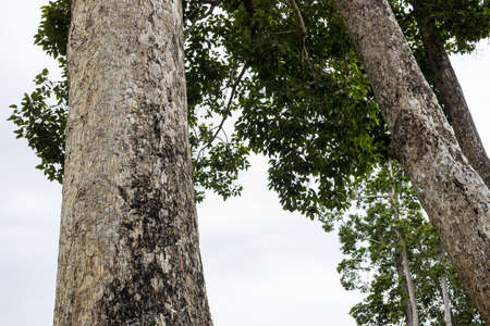 A view from the roots of many tall Dipterocarpus alatus Roxb trees that thrive and live long in an ancient forest plantation of the Thai countryside during cloudy periods.