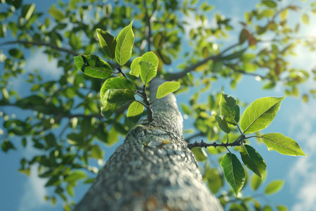 An upward perspective captures a large tree showcasing dense, green foliage against the sky. The image highlights the textured bark and intricate branching patterns. The composition is likely captured outdoors, bathed in natural light. This photograph could be utilized for various commercial purposes, including illustrative content and background applications.