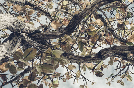 Leaves on treetop in sunshine, vintage color style