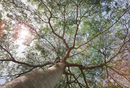 Green jungle tree with green leaves and sun light and plant detail nature in the forest look under tree / beautiful bottom view to the tree top