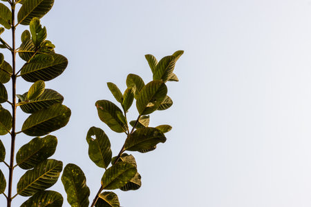 Guava branches with lean leaves down view under the clean sky