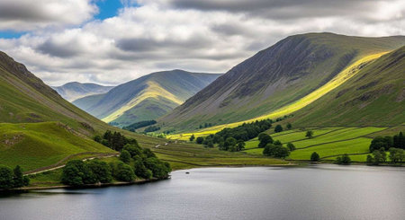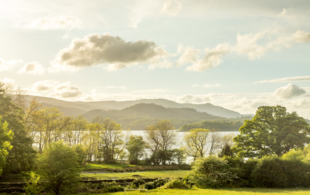Countryside landscape view of green tree and grass wtih mountain and lake background under cloudy evening sky in rural England