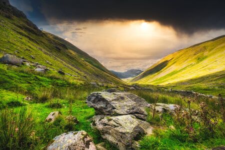Sunset at a valley among the mountains of the famous Lake District in England