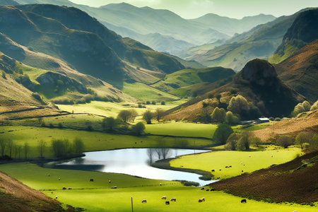 the picturesque malham peninsula in the heart of yorkshire dales national park, england, is showcased in this breathtaking, photorealistic image, capturing the dreamy, serene atmosphere of the rolling hills, lush green pastures, and meandering streams, evoking a sense of tranquility and connection with nature. ai generated