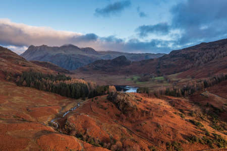 Stunning Autumn Fall vibrant sunrise over Blea Tarn in the Lake District with High Raise and The Langdales in the distance