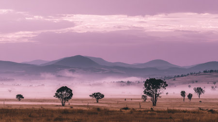 Fog covers the grassland plain as the sun rises, creating a scene with trees and distant mountains under a soft sky in the early morning.