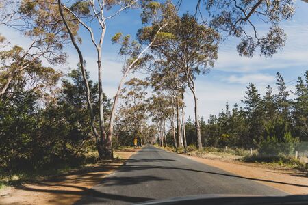 Australian countryside road trip view from the car with empty road and eucalyptus bush, taken in Tasmania driving along the road to Seven Mile Beach