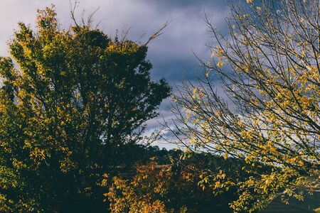golden hour sunglight shining on big trees with autumn leaves and hills in the background, shot in Tasmania Australia
