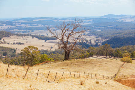 Australian countryside landscape as viewed from the car during a road trip in Tasmania, with dry land and eucalyptus trees