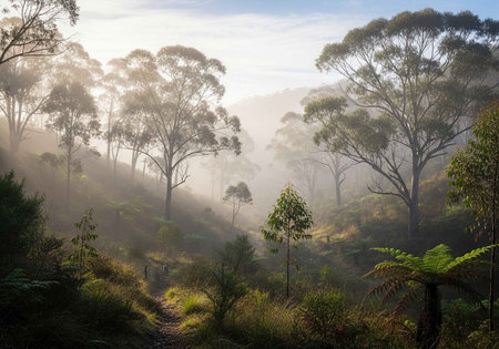 Sunrise in the eucalyptus forest, Australia.