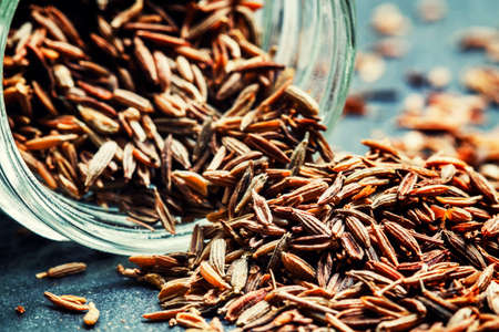 Zira or cumin, oriental spices, grains poured out of a glass jar, black background, macro shot, selective focus