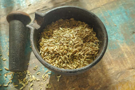 Cumin seeds in old indian cast iron mortar