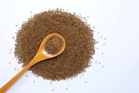Cumin grain in a spoon composition on a white background. Cumin close up texture. Macro lens.