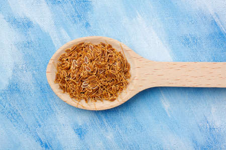 Dill (Anethum graveolens) seeds on wooden spoon over blue painted textile background