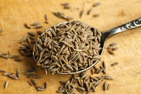 cumin seeds on spoon on table , close up