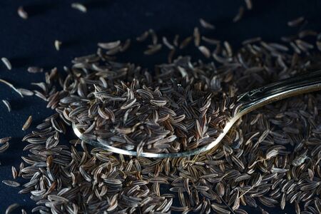 spoon caraway seeds of on table macro