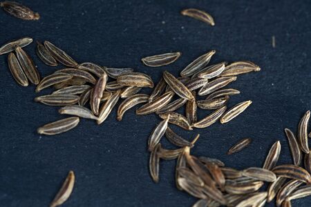 Seeds of cumin on a dark stone background.