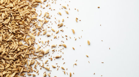 A close-up view of dried fennel seeds scattered on a white background. This image showcases the natural texture and color, perfect for culinary uses.