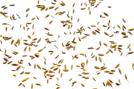 Closeup of cumin seeds, isolated on white background.