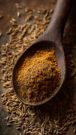 Close-up showcases aromatic caraway powder piled in a rustic wooden spoon, surrounded by whole caraway seeds. The image highlights the spice's texture and color.