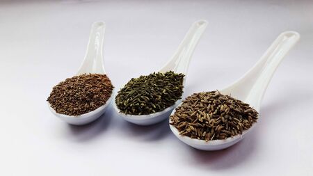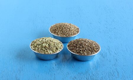 Carom seeds, caraway seeds, and fennel seeds, which are said to have health benefits, in steel bowls.